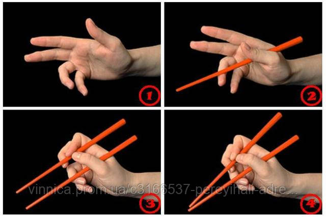 Потім верхня паличка кладеться на третю (нігтеву) фалангу середнього пальця, першу фалангу вказівного, і притримується кінчиком великого; паличку потрібно тримати приблизно як олівець.